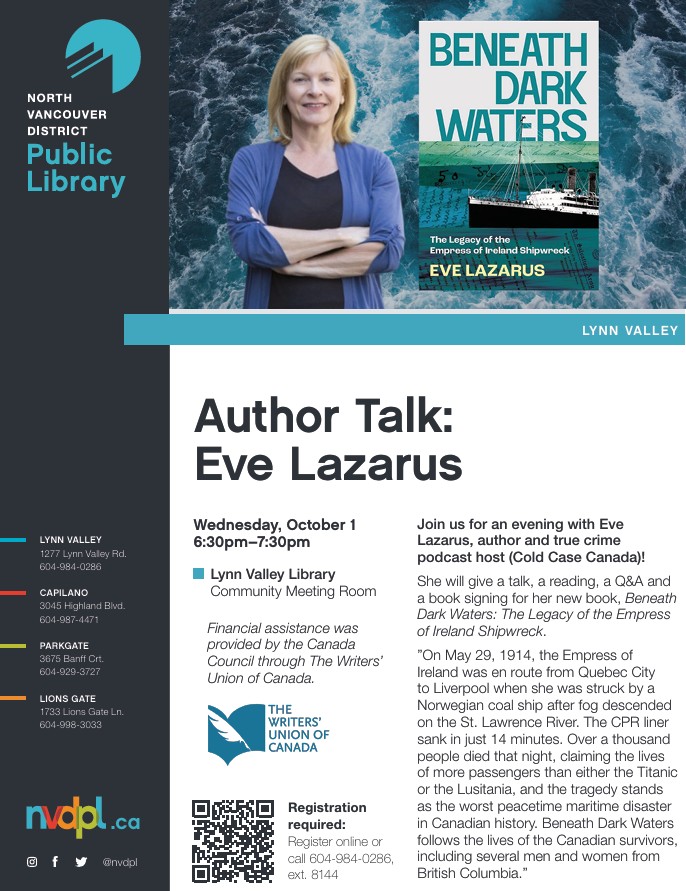Join us for an evening with Eve Lazarus, author and true crime podcast host (Cold Case Canada) as she gives a talk, a reading, a Q&A and a book signing for her new book, Beneath Dark Waters: The Legacy of the Empress of Ireland Shipwreck.