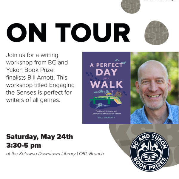 Kelowna, Bill Arnott is headed your way. He’s offering a free workshop at Kelowna Downtown Library Okanagan Regional Library. This workshop titled “Engaging the Senses” is perfect for writers of all genres and experiences. Bring whatever you need to write and get ready to be inspired!