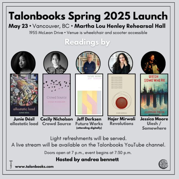 Celebrate the new spring releases from Talonbooks! Please join us at the Martha Lou Henley Rehearsal Hall on Friday, May 23, to welcome the following books to the world: